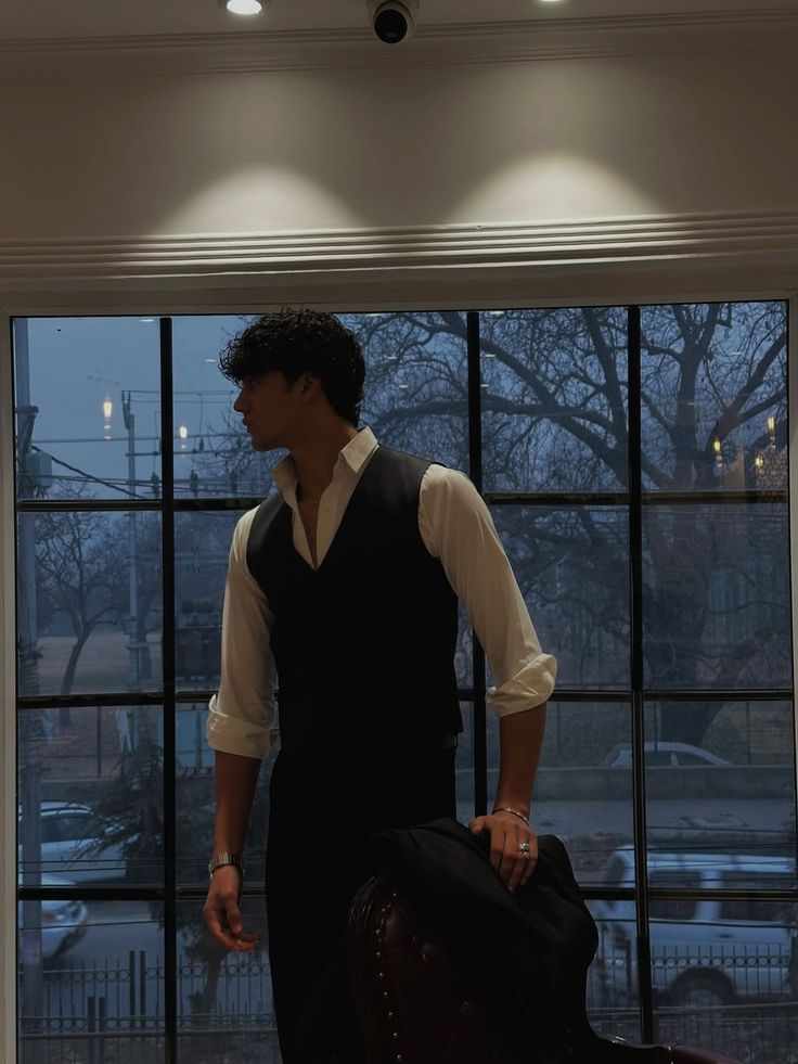 "New here..?" A man in suit asks her. Chestnut hair, a stubble and sharp jaw.